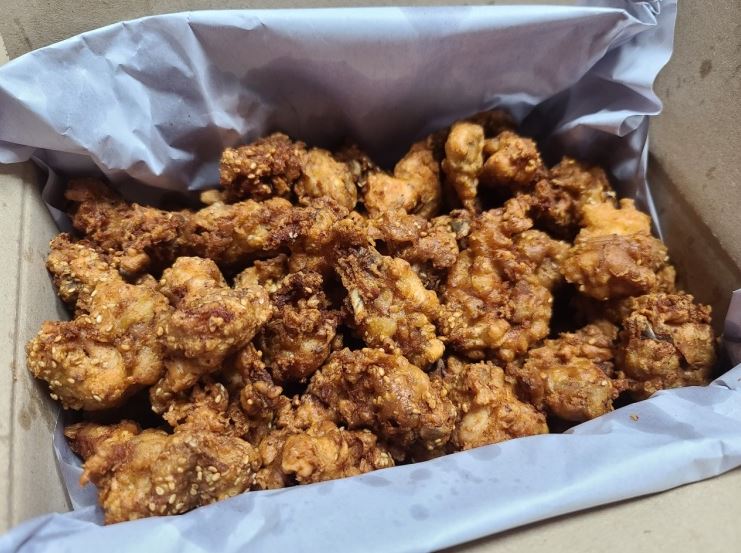 레트로 느낌 제대로, 영화 세트장 안에 있는 식당 같아요. 포장만 가능하고요(순살아님), 주문하면 튀김옷 양념부터 시작입니다. 가게 앞 의자에 앉아서 구경하는 재미가 있네요. 분홍색 양념통에서 양념과 물을 넣고 튀김옷 반죽부터 시작하시는데요, 3숟가락 정도 넣은 게 맛소금 같아요. 지병이 있다거나, 아이들이랑 먹을 경우엔 소금 빼달라고 해도 좋을 것 같아요. 반죽을 밀가루로 하는 게 아니라 튀김가루로 하시거든요. 생강분 넣지 않고 다진 생강 넣어주셔서 생강향과 색이 살아있어요. 반죽된 고기를 기름 앞에서 다시 섞을 때 노란 동그라미의 깨를 엄청 넣으시더라고요. 아미 받치고 튀기셔서 탄 부위 없이 고루 잘 익었고요, 전분도 들어가서 엄청 바삭하고 맛있어요. 2층에 있어서 찾기힘들수있어요. 가마솥에다 직접튀겨주신 깨통닭입니다. 주말은 사람이 많아서 미리전화주시고 가야될정도입니다.